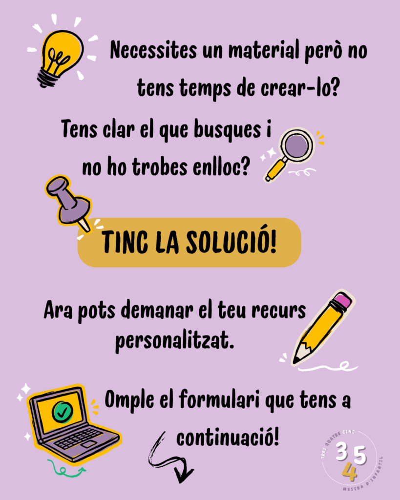 Demana el teu recurs! Explica’m quin tipus de material t’agradaria tenir. Pot ser una activitat per a l’aula o qualsevol altra idea que et faciliti la feina. Reviso totes les propostes i, si és viable, el recurs podria aparèixer aviat a la web! OMPLE EL FORMULARI